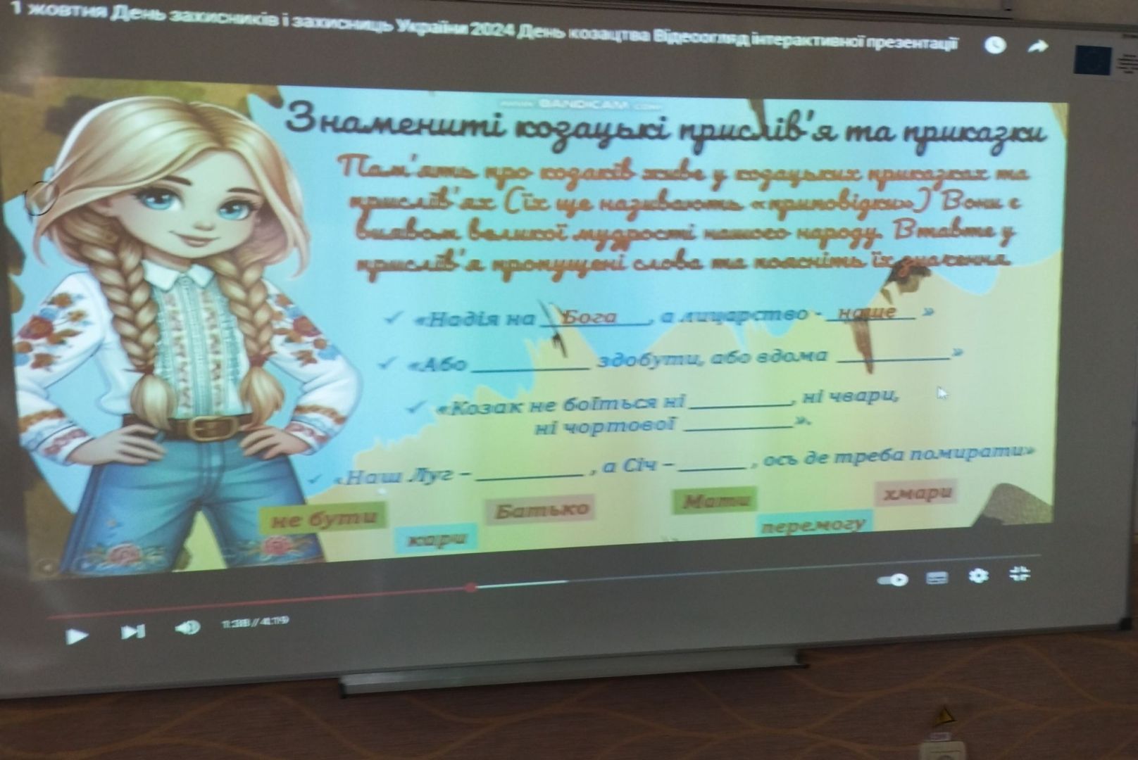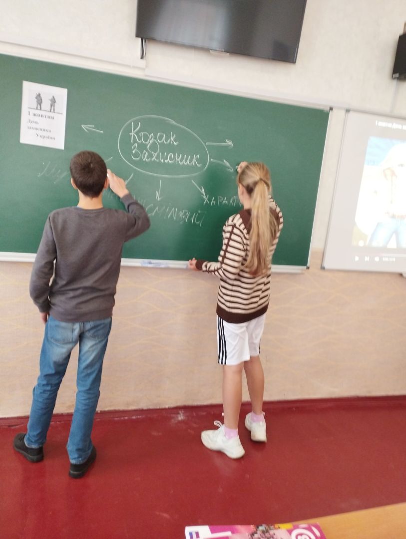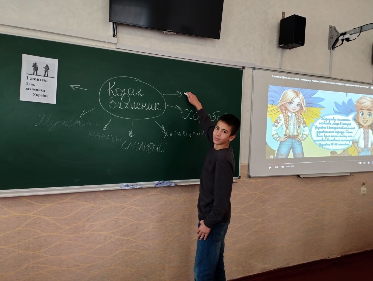 Сьогодні, 1 жовтня, у нашій країні відзначають одразу три свята: День Захисника України, День козацтва та релігійне свято Покрови . Здобувачі освіти 7 Б класу на виховній годині дізналися , чому саме ці свята разом відзначають в один день. Також діти пригадали основні якості козаків та захисників України та визначили,що вони є спільними. Учні переглянуди вілео,розгадували анаграми, доповнювали прислів'я, відповідали на питання вікторини. А наприкінці дівчата класу привітали хлопців, майбутніх захисників, і подарували їм квитки у кіно.