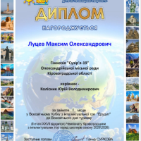 Учень 9-А класу Гімназії "Сузір'я-19" Олександрійської міської ради ЛУЦЕВ МАКСИМ зайняв І місце (ювенальна група) на ІІ етапі ХХVІІ відкритого Чемпіонату Кіровоградщини з інтелектуальних ігор серед школярів сезону 2025-2026 року (Всесвітнього Кубку з інтелектуальної гри "Ерудит" до Всесвітнього дня туризму)