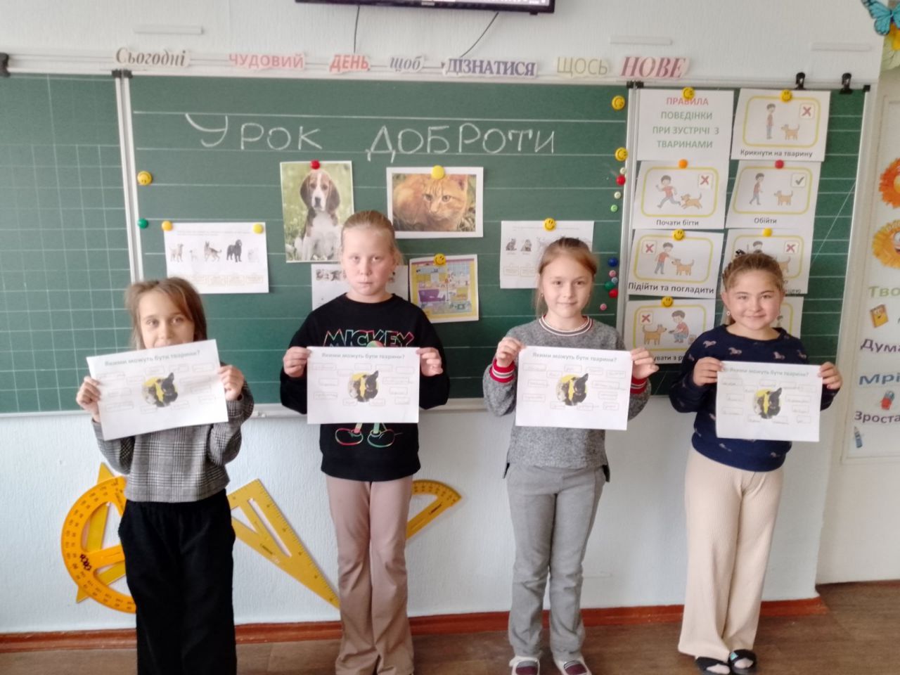 В 3 класах було проведено Уроки Доброти. Учні повторили правила поведінки при зустрічі з тваринами, дізналися які є породи тварин і як за ними піклуватися. Складали анкету-паспорт своєї тваринки і розповідали класу. Слухали казки про тварин, виліплювали свого песика.